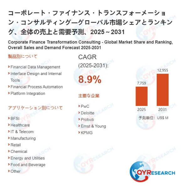 QYResearchが発表した新たな市場調査レポート「コーポレート・ファイナンス・トランスフォーメーション・コンサルティング―グローバル市場シェアとランキング、全体の売上と需要予測、2026~2032」によると、世界のコーポレート・ファイナンス・トランスフォーメーション・コンサルティング市場規模は、2024年の約77億4700万米ドルから2025年には77億5900万米ドルへと順調に拡大すると見込まれています。予測期間中は年平均成長率(CAGR)8.9%で成長し、2031年には129億5500万米ドルに達すると予測されています。
