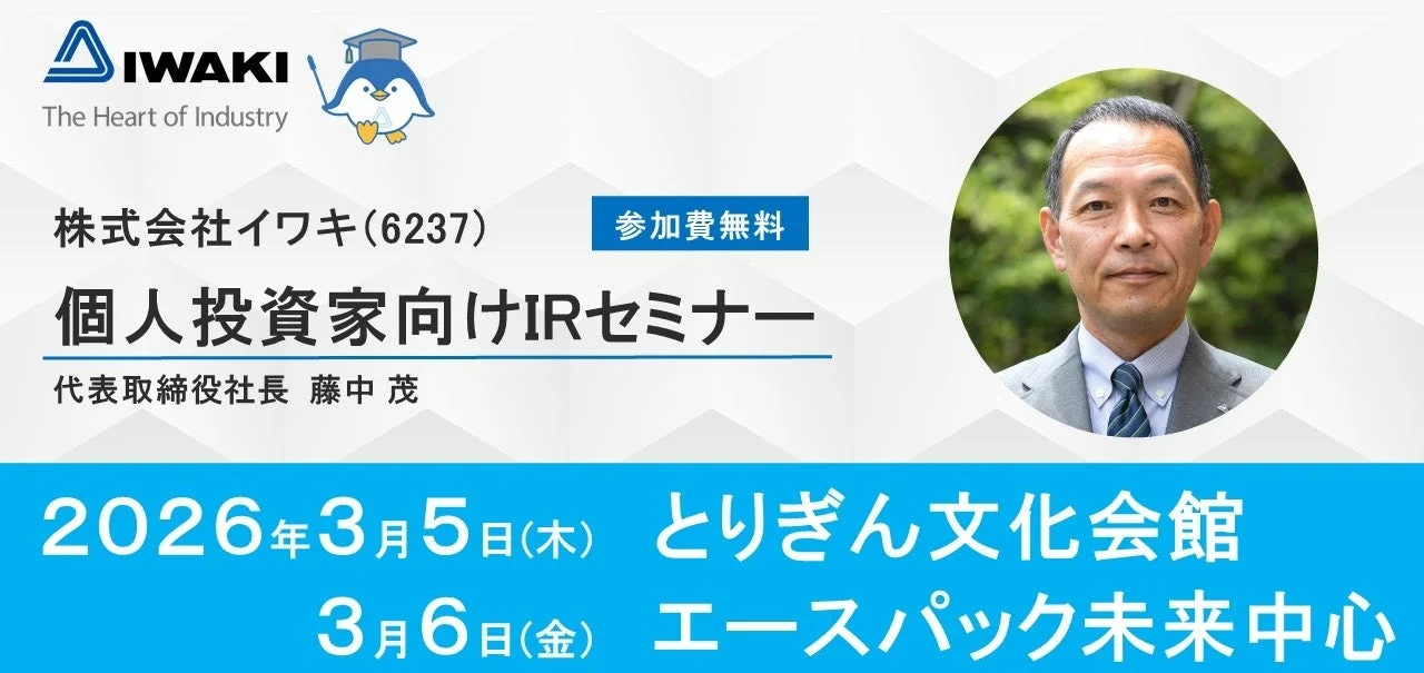 本セミナーでは、株式会社イワキの代表取締役社長である藤中茂氏が登壇し、企業の概要や今後の展望について直接説明します。参加費は無料、各日100名が募集定員です。