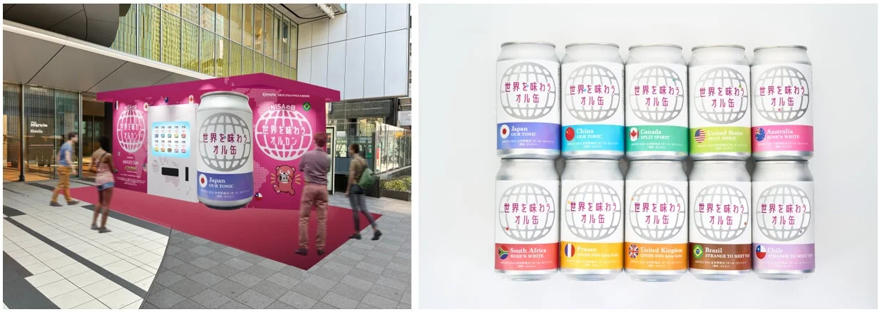 本イベントでは、「オルカン」にちなんだオリジナルデザインの缶ジュース「オル缶」が登場します。世界各地域の代表的な国をイメージした計10種のドリンクが用意され、LINEアンケートに回答し専用の巨大コインを投入すると、最低1ヵ国分、最大で10ヵ国分の「オル缶」が一度に払い出されます。