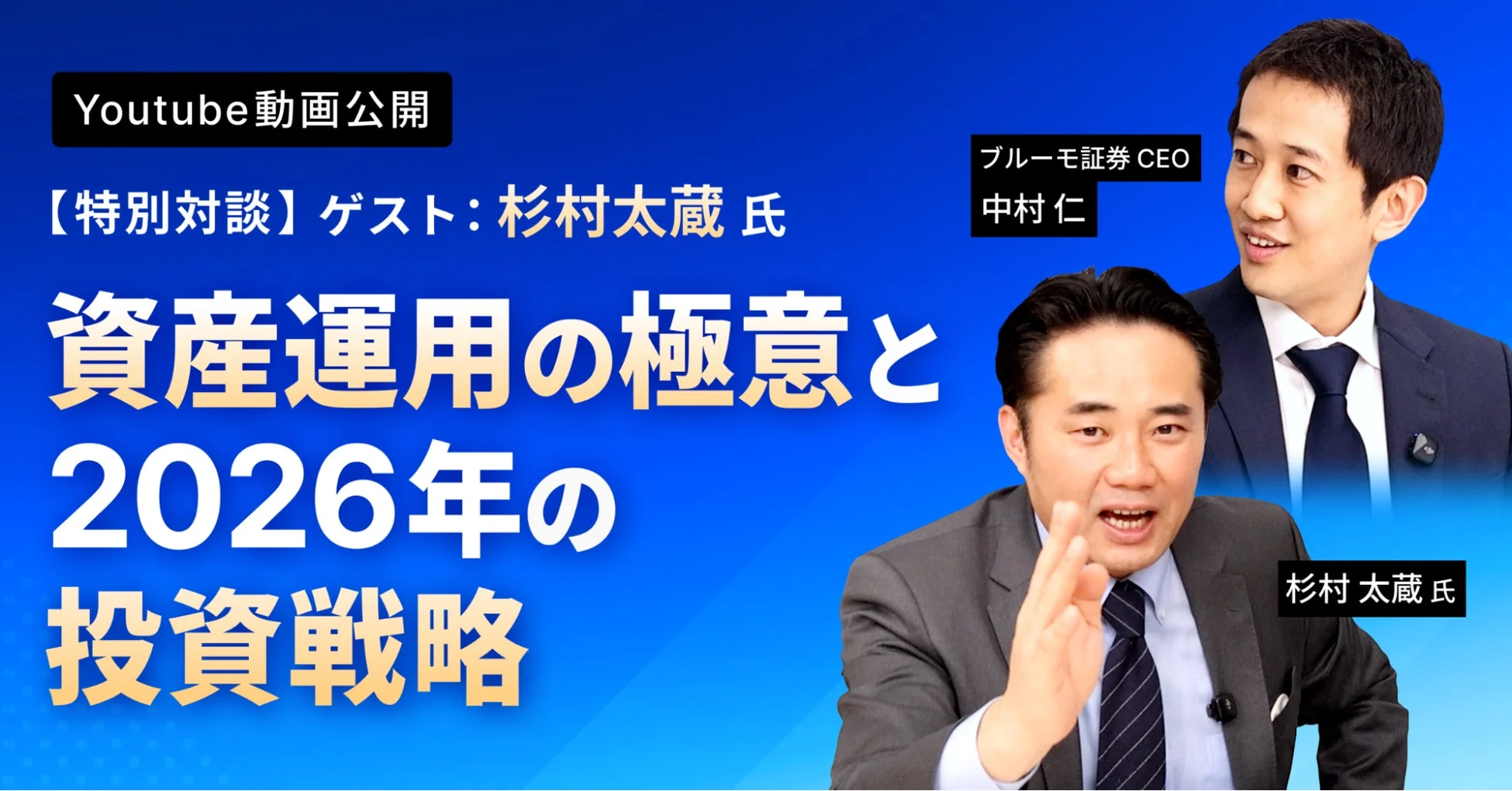 第三弾では、元衆議院議員である杉村氏と元財務官僚のブルーモ証券CEO中村仁氏が対談し、政治・政策・地政学リスクを考慮した2026年の投資戦略について議論します。マクロな視点に立った資産運用の考え方が提示される内容です。