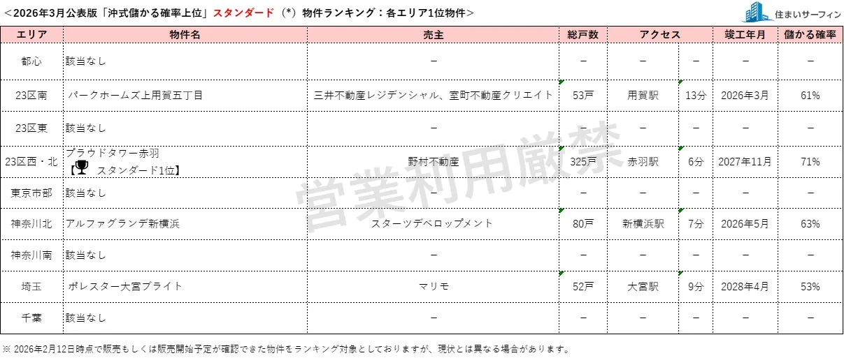 2026年3月公表版「沖式儲かる確率上位」スタンダード物件ランキング:各エリア1位物件