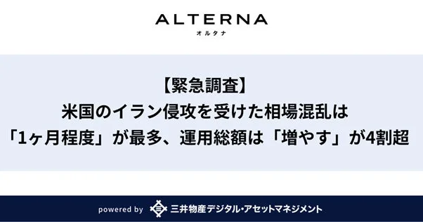 - 個人投資家の動向を緊急調査:イラン侵攻による市場混乱は「1ヶ月程度」の見方が最多、運用総額「増やす」が4割超
