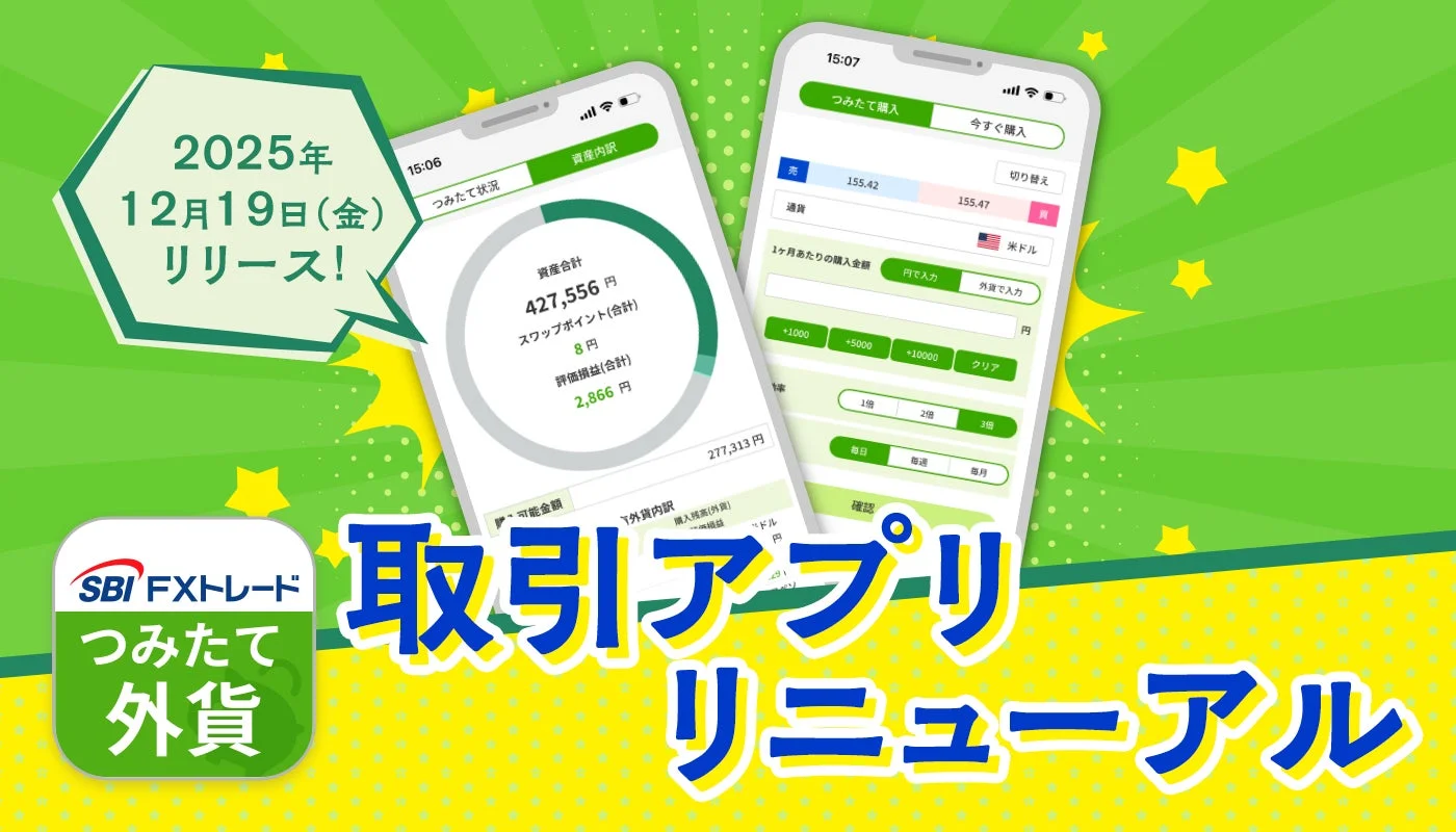 SBIホールディングス株式会社の連結子会社であるSBI FXトレード株式会社は、スマートフォン版外貨取引アプリ『つみたて外貨』を2025年12月19日(金)にリニューアルしました。この度のリニューアルは、ユーザーからの意見や要望を反映し、画面構成や文言を見直すことで、視認性と操作性を大幅に改善しています。