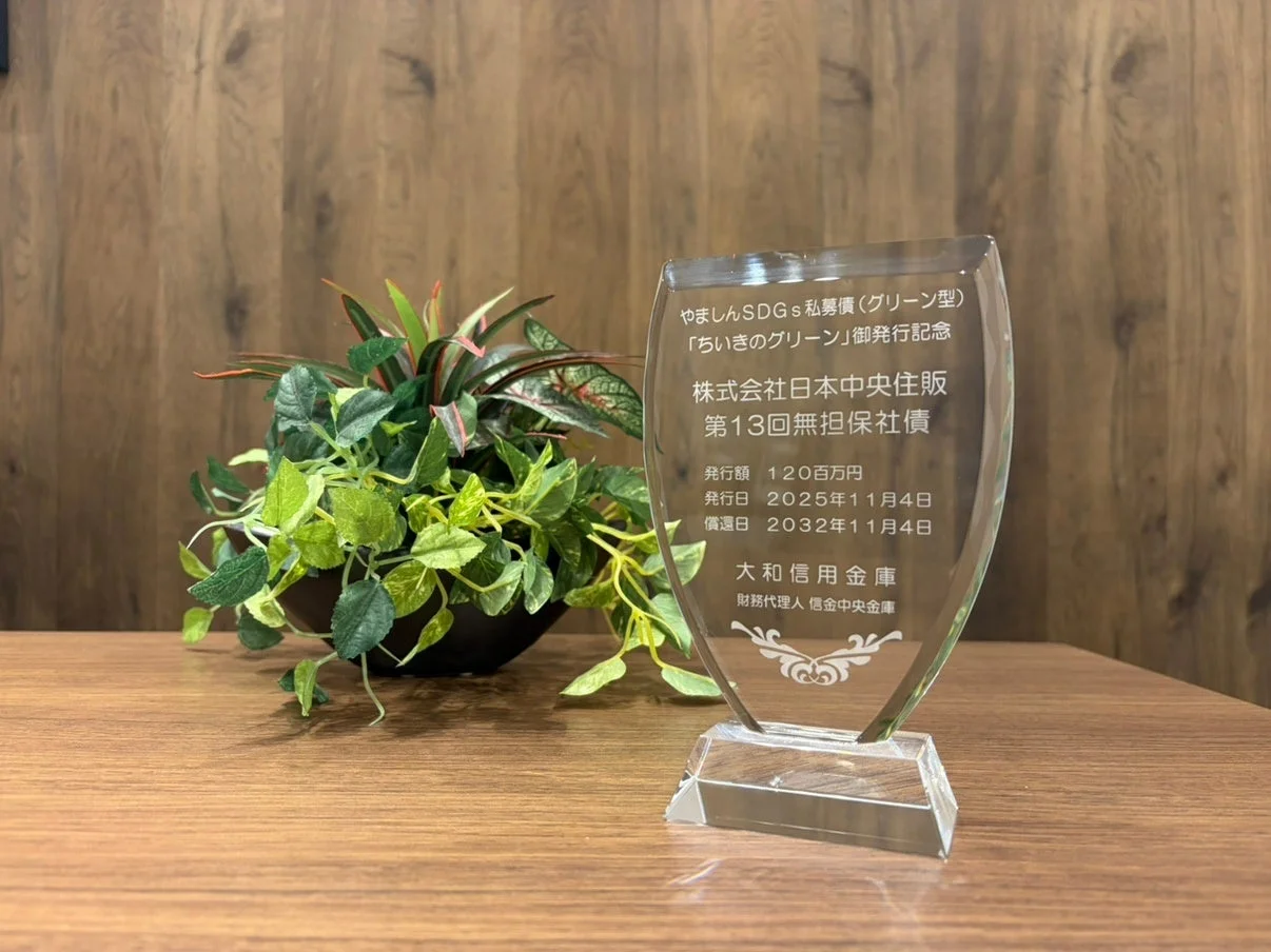 2026年4月13日には、本私募債の発行を記念し、大和信用金庫より記念の盾が日本中央住販へ贈呈されました。