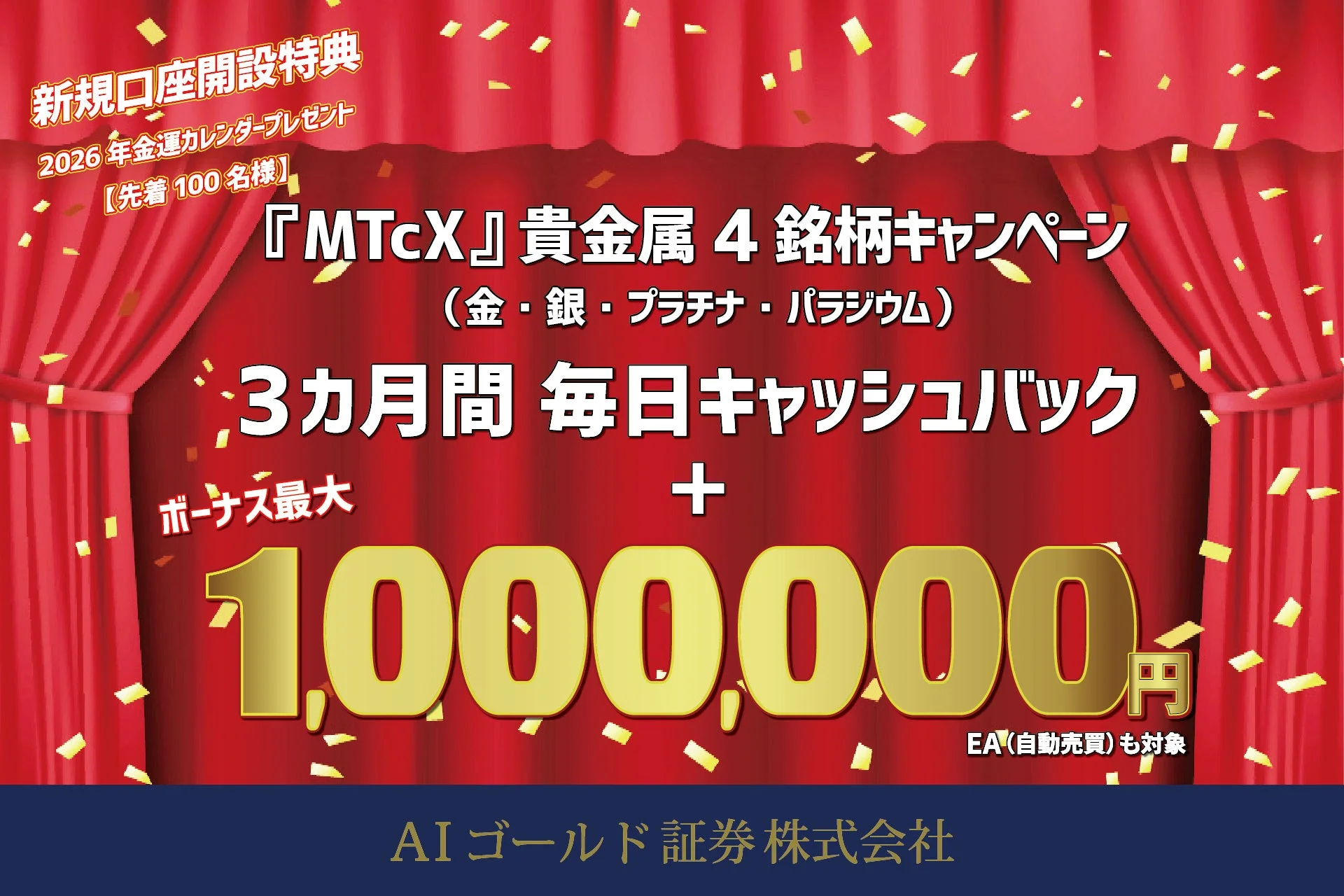 本キャンペーンは、2026年1月1日(木)から2026年3月31日(火)までの期間に実施されます。対象商品は、MTcXの貴金属4銘柄(金・銀・プラチナ・パラジウム)です。裁量取引およびEA(自動売買プログラム)による取引も対象となります。
