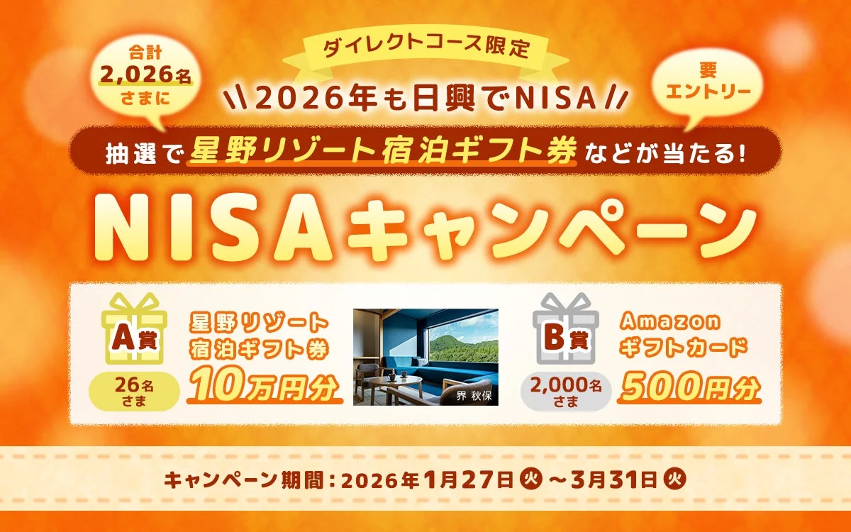 SMBC日興証券株式会社は、2026年1月27日より、ダイレクトコース限定の「<2026年も日興でNISA>NISAキャンペーン」を開始しました。本キャンペーンでは、合計2,026名に星野リゾート宿泊ギフト券やAmazonギフトカードが抽選で当たります。