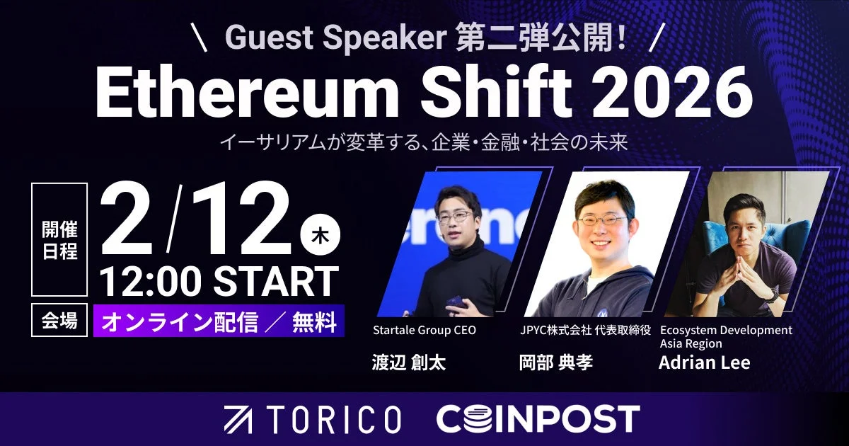 株式会社TORICOと株式会社CoinPostは、共催するオンラインイベント「Ethereum Shift 2026」において、第二弾登壇ゲストとセッション内容の詳細を公開しました。さらに、新たに「NADA NEWS」がメディアパートナーとして加わります。本イベントは、イーサリアムに関する理解促進およびエコシステム発展への貢献を目指します。